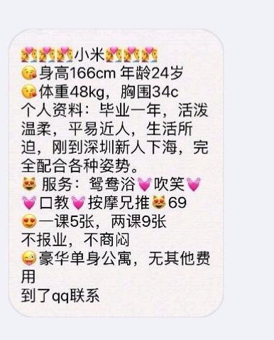 【寻欢时间】:2019年02月 【寻欢地点】:省份广东、城市深圳市南山(大概位置) 【信息来源】:亲身体验 【服务项目】:鸳鸯浴,漫游,胸推,69式,冰火,口活,爱爱、SM(可选,勿必填写真实服务项目) 【妹妹数量】:1 【环境设备】:100自住公寓 【营业时间】:联系上就好 【价格一览】:500/p或900/pp等 【安全评估】:评分,满分100。 【服务星级】:★★★★★(最高5星)应适当评价质量 【重点推荐】:最值得推荐的地方以供参考 【联系方式】:[unfree]QQ:359172358,[/unfree] 【寻欢细节】:精虫上脑所以赶忙在群里联系妹妹,指挥遥控到地之后稍等了一会前面有老哥先打仗了,在楼下全家半小时过后遂上楼上课,具体内容狼友大都了解就不叙述了,不过此妹妹新人一个,水是真多 【附带照片】: