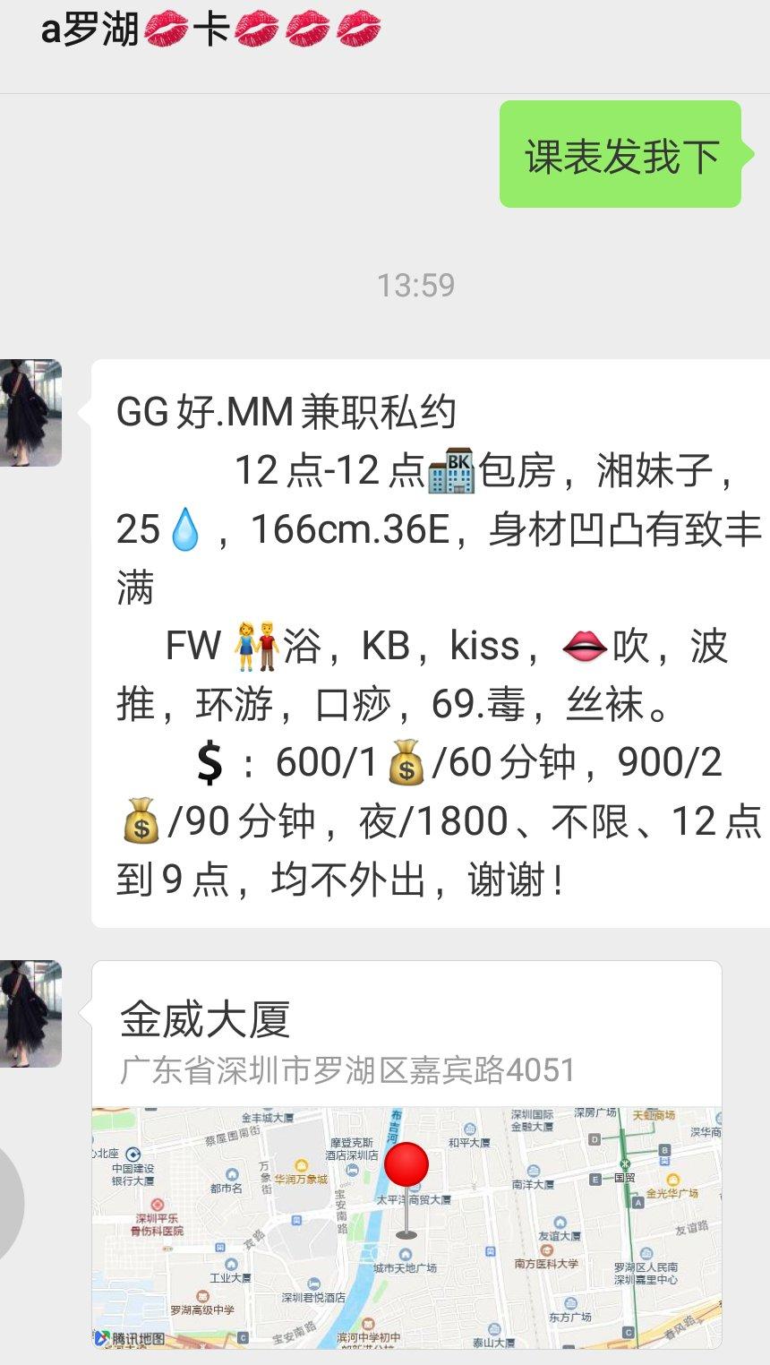 【寻欢时间】:2019年6月10日 【寻欢地点】:深圳罗湖 【信息来源】:狼友推荐、论坛、亲身体验 【服务项目】:鸳鸯浴,KB,漫游,胸推,69式,冰火,口活,爱爱(自己看课表) 【妹妹数量】:1 【环境设备】:一般 【营业时间】: 【价格一览】:600P 900PP 1800YE 【安全评估】:95 【服务星级】:★★★★(最高5星) 【重点推荐】:36E大胸妹 【联系方式】:[unfree]微信:aa18569780308[/unfree] 【寻欢细节】:服务很好,湘妹子,大胸妹,两个胸都够玩了。价格小贵~ 【附带照片】: