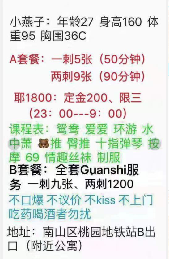 [xinxitop]提示信息[/xinxitop] 【寻欢地址】:深圳 【妹子网名】:南山小燕子 【服务项目】: 【价格一览】: 【联系方式】: