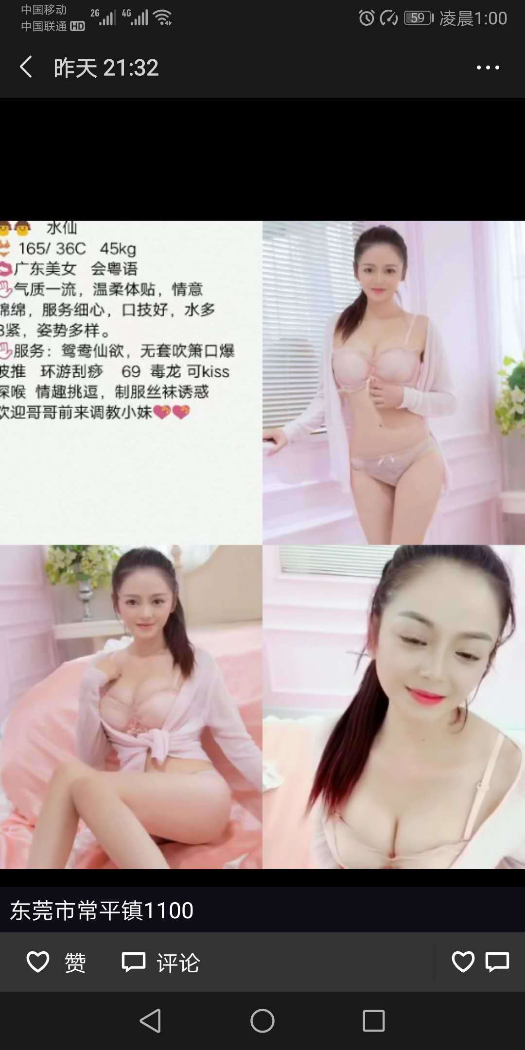 [xinxitop]提示信息[/xinxitop] 【寻欢时间】:2019年12月 【寻欢地点】:广东 东莞 寮步 常平 南城 【信息来源】: 亲身体验 【服务项目】:鸳鸯浴,漫游,胸推,69式,冰火,口活,爱爱、SM(可选,勿必填写真实服务项目) 【妹妹数量】:N 【环境设备】:N 【营业时间】:N 【价格一览】:100-1000 【安全评估】:评分,满分100。 【服务星级】:★★★★★(最高5星)应适当评价质量 【重点推荐】:最值得推荐的地方以供参考 【联系方式】:微信 寮步的mm52m00 【寻欢细节】:没钱买别人资料 分享下自己的资料赚点G币 我这联系方式大部分是鸡头 1. 寮步去过4 5次 长得还可以 都是洗吹做 吹也就吹一会 我是觉得没意思 一般330一次 650 2次 砍砍价能300一次600 2次 2. 南城会所 悦雅去过 砍价600一次 带服务 有按摩 胸推 漫游 69没试不知道你们自己问 我觉得还可以 妹子有几个 有一个胸又大又挺 还不错 果果会所没去过 价格和悦雅一样 打算去一次 3 4.石龙 700 2次 服务就是一般的 说点题外话 微信附近人人可以找到很多酒店做的鸡头 我去过几次 400一次 不要相信写的什么服务 只有口 做 口也就一会 另外上门的全是骗子(我遇到的)QQ群加的上门的都是骗子 都是聊单的 他们发你的图片和来的小姐 完全没关系 他们和你谈好价格 找鸡头喊小姐过来 他们也不知道来的什么人 一般来的小姐都不好 服务写的什么全套都是扯淡 只有口 口硬就给你戴套搞 还有你和那边说好700做2次 小姐做完一次找借口走了 上门的要小心 找过几次很坑 完全不值 快餐就不写了 不喜欢 站街的100一次 说实话长得也有可以的总结便宜没好货 网上发你的照片百分之90是假的 【附带照片】: