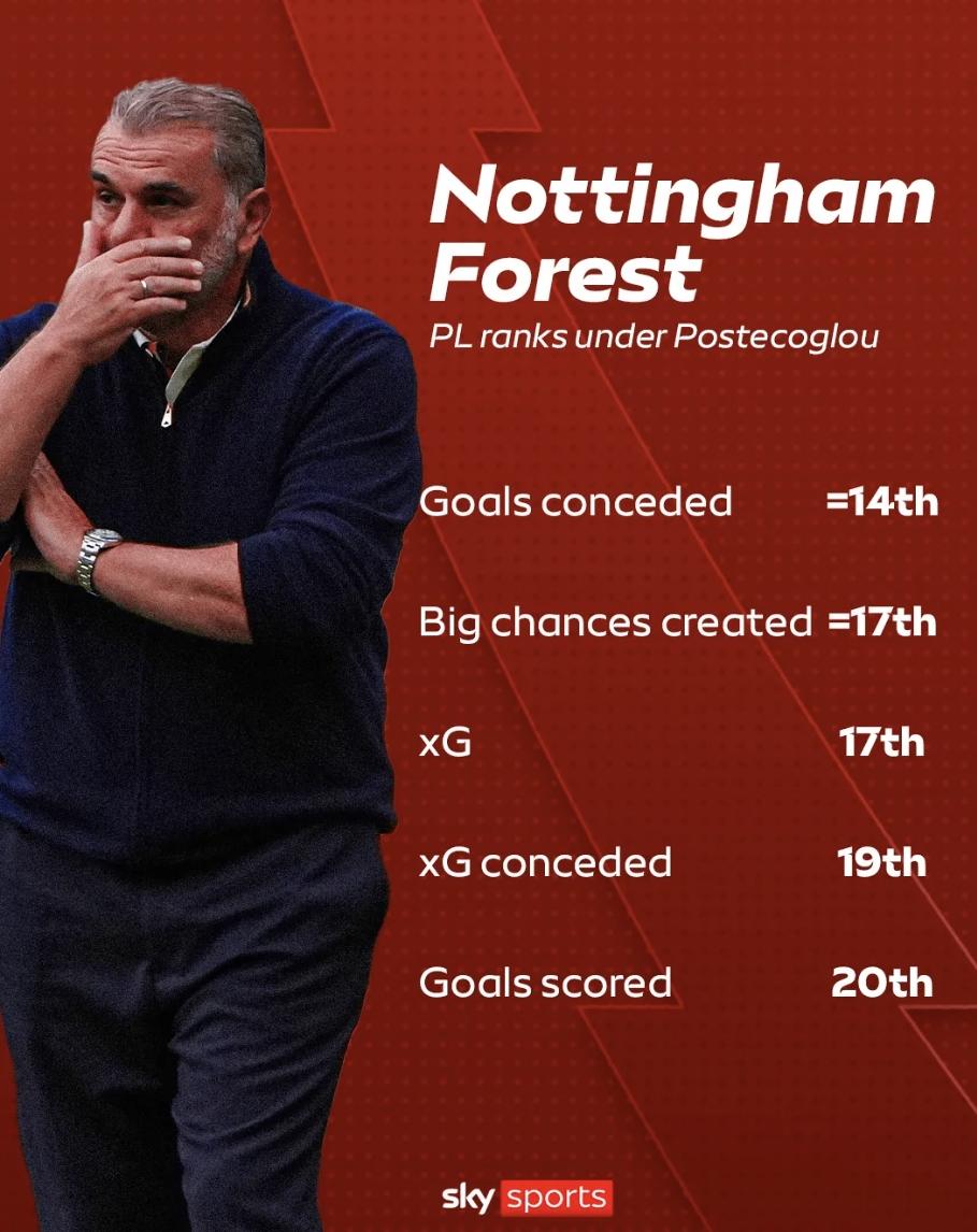 澳波执教后森林各项数据排名:进球最少,预期丢球第二多