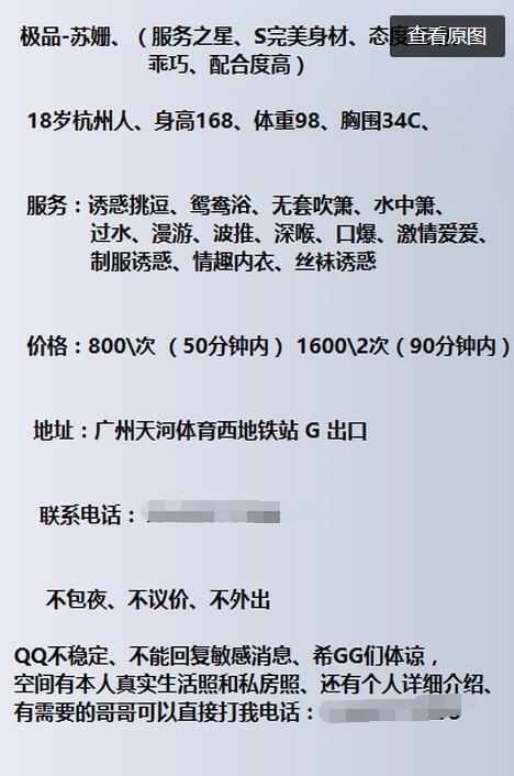 标题没有写联系成功的帖子请谨慎购买,不一定能联系成功的,先钱不可信 【寻欢时间】:2016年11月 【寻欢地点】:广州天河体育西地铁站 G 出口 【信息来源】:网络 【服务项目】:诱惑挑逗、鸳鸯浴、无套吹箫、水中箫、深喉、69、口爆、激情爱爱、制服诱惑、情趣内衣、丝袜诱惑 【妹妹数量】:没问 【环境设备】:该有都有 【营业时间】:这个需要自己问 【价格一览】:800次 (50分钟内) 16002次(90分钟内) 【安全评估】:不去最安全 【服务星级】:70 【重点推荐】:无 【寻欢细节】:妹子很不错,已验证,是本人,样貌性感诱人,身材比例好,胸c,苗条长腿,特别是服务和态度很好,省吃俭用再来一次:lol 【总体评价】:略 【联系方式】: