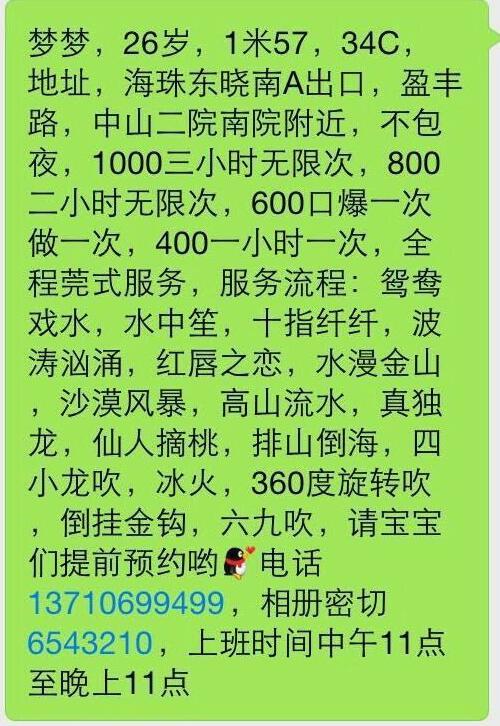 标题没有写联系成功的帖子请谨慎购买,不一定能联系成功的,先钱不可信 【寻欢时间】:2016年11月 【寻欢地点】:海珠 【信息来源】:网络 【服务项目】:很多 【妹妹数量】:没问 【环境设备】:该有都有 【营业时间】:这个需要自己问 【价格一览】:400 【安全评估】:不去最安全 【服务星级】:70 【重点推荐】:无 【寻欢细节】:在群里看到的,然后就联系啦 【总体评价】:略 【联系方式】: